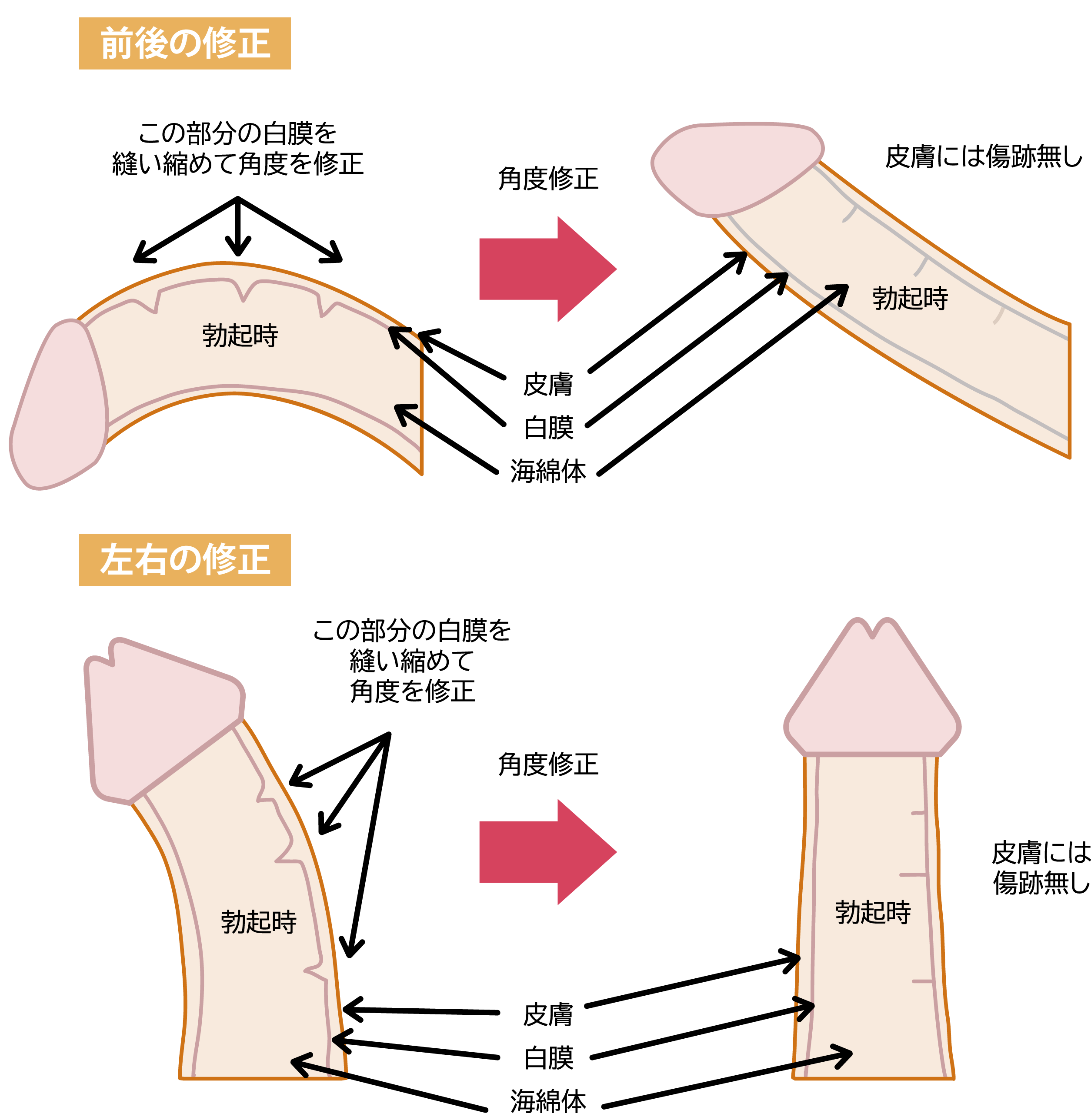 ペニスの曲がりの原因となっている白膜を、上下左右バランスよく調整することで、ご希望の勃起形状に修正する手術が、屈曲・湾曲ペニス修正術です。